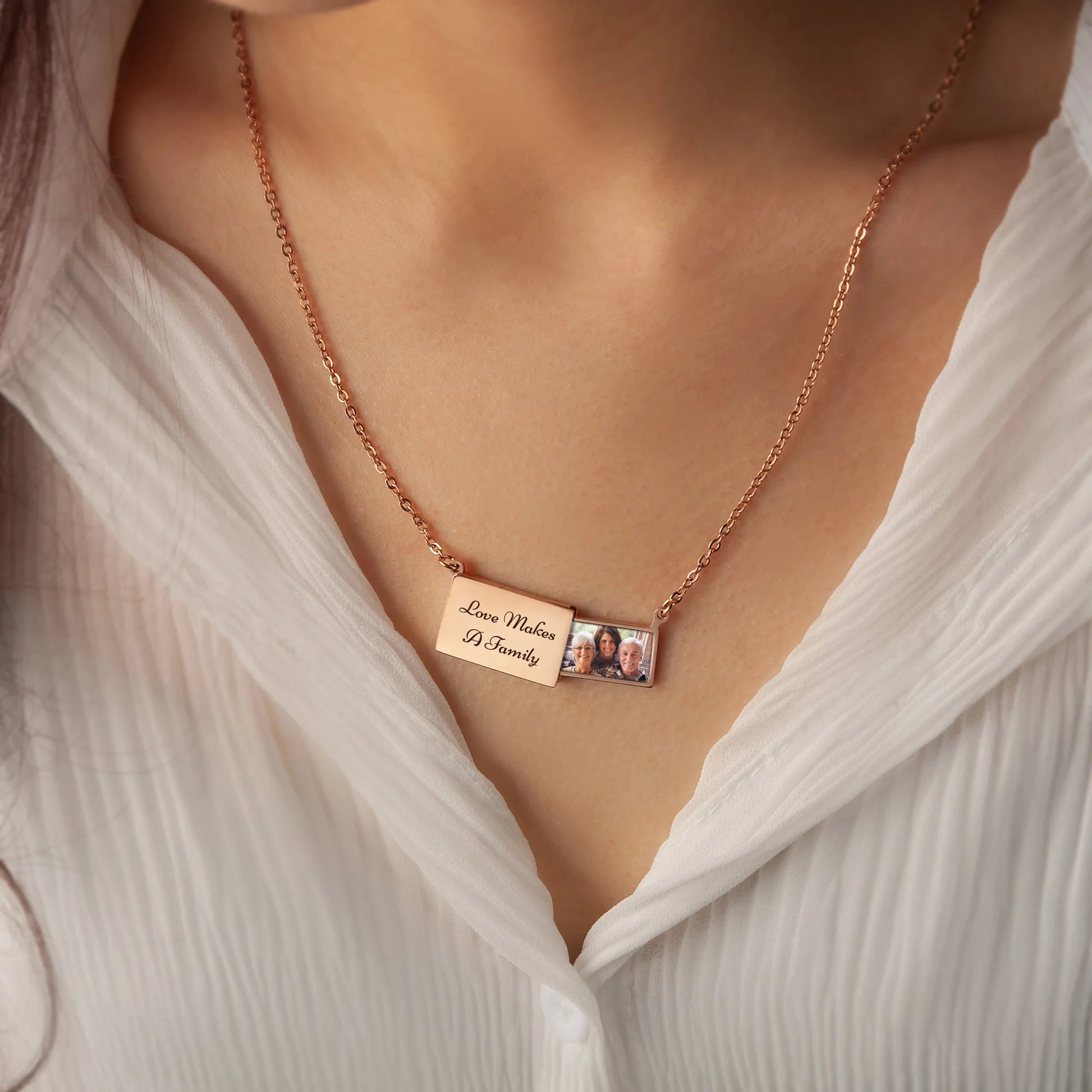 🌟A beautiful metal postcard design necklace engraved with your message on the front,add a photo of you inside.This handmade postcard charm necklace is one you will seamlessly add to your everyday wear.